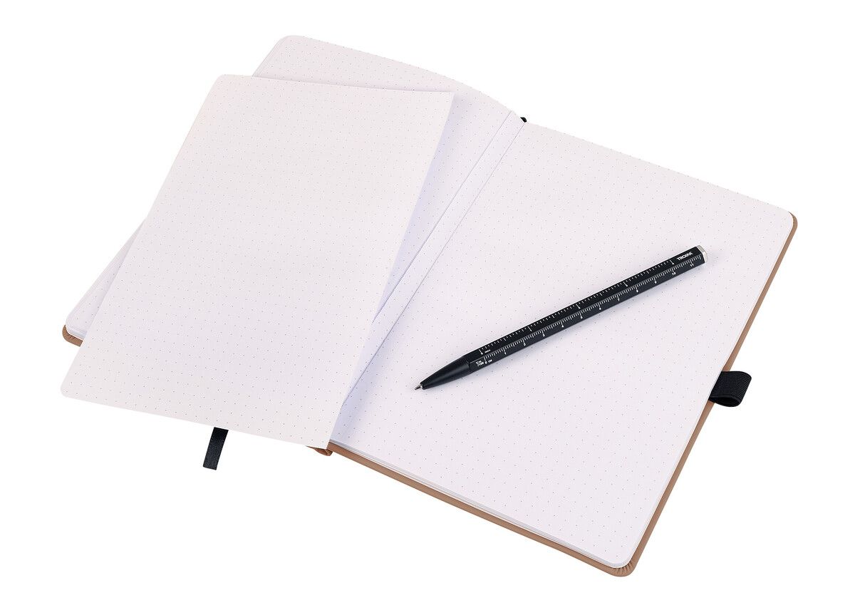 The A5 notebook provides ample space for your notes with 64 perforated sheets (128 pages) of Eco-friendly, FSC-certified paper featuring a dot grid for neat writing. Its faux leather hard cover is durable and has a secure elastic band closure.