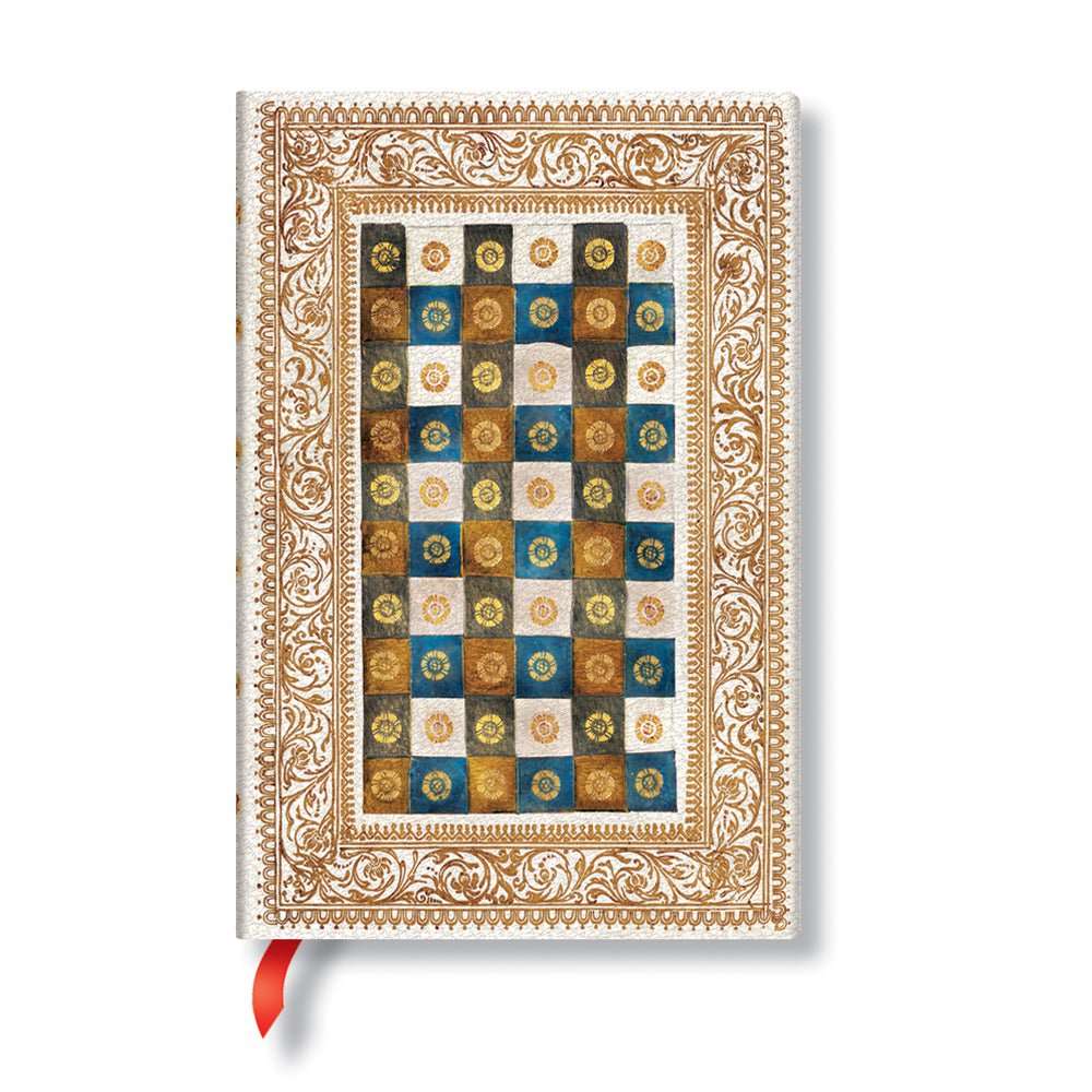 Paperblanks’ Venetian Mornings Aureo journals capture the feeling of daybreak in ancient Venice, with its fine gold borders, lace fillets, marbled endpapers, and multicolored checkers in the midfield. Inspired by an Italian cover in the 1600s for a book called The Treatise on Colors, the Aureo notebook embraces the Renaissance value of cultural rebirth, mixing an ancient bookbinding method with contemporary bookmaking techniques.